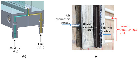 Schematics of experimental setup (a); fuel and oxidizer injectors (b); and the fragment of an insulator with spark gaps (c).