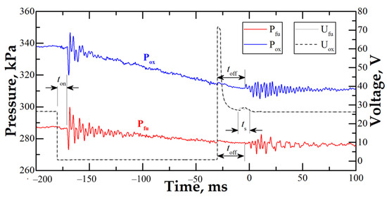 Typical records of voltage on the solenoid valve coils ( and ) and pressure in the receivers ( and ) for experiment no. 333 with mixture (0.65C2H4 + 3O2); is the delay time for turning on the solenoid valves (9 ms in this experiment); is the delay time for turning off the solenoid valves (26 ms in this experiment); is the switching time (4 ms in this experiment). The time is counted from the ignition.