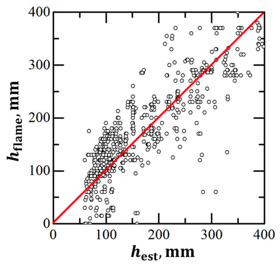 Based on video recording of the luminosity front, the height of the layer is determined at the initial stage of flame propagation () when the luminosity front covers a distance of 10 mm hidden from observation by the metal frame and appears in the window in the visual observation area. Figure 3 shows the dependence vs. , illustrating the deviation of the true height of the layer from its estimated value. In experiments with premixed compositions [26], the values of and differed insignificantly when the height of a combustible mixture layer was less than 100 mm. However, when increasing the layer height, blurring of the layer boundary became noticeable due to the difference in flame-front velocities at the slit bottom and at the upper boundary of the layer. In the experiments with a separate supply of fuel and oxidizer considered herein, a significant scatter in the values is observed. This scatter is nearly symmetrical with respect to the straight line in Figure 3 corresponding to the equality . The values below the straight line with can be caused by poor mixing of fuel with oxidizer, mixture heterogeneity, and incomplete displacement of air during slit fill. The values above the straight line with can be caused by high speeds of fuel and oxidizer jets, leading to the formation of a combustible mixture layer with a height greater than the calculated height, e.g., in cases of elevated flow rates or short injection times, when stationary gas flow rates are not established.