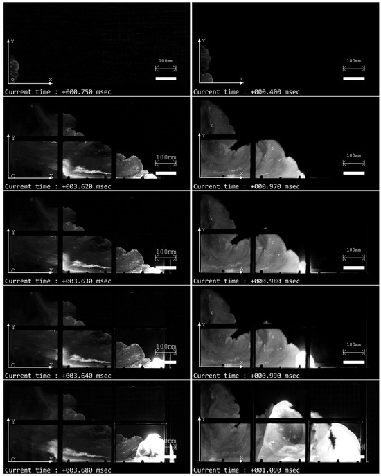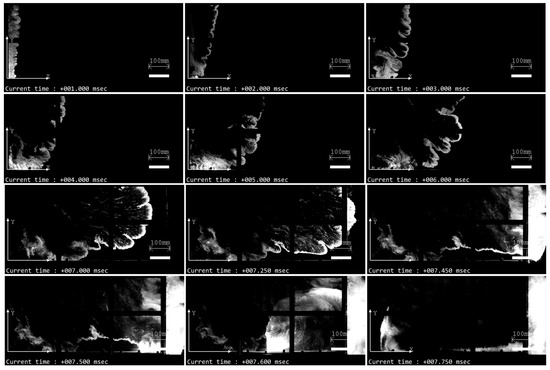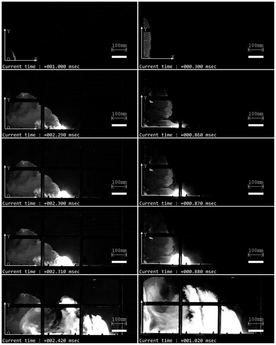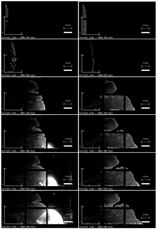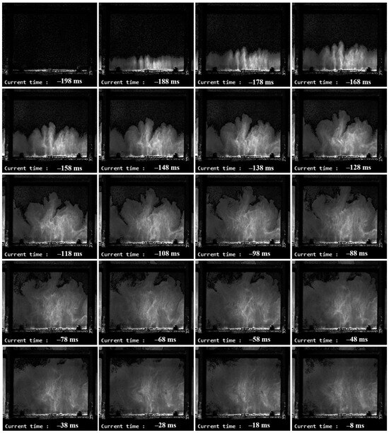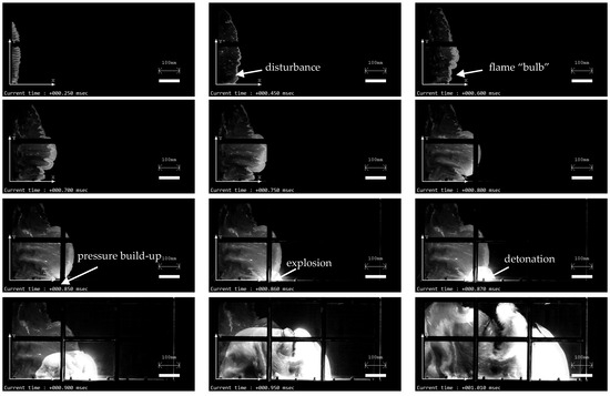 The combustible mixture forms due to mixing of coaxial gaseous jets of fuel and oxidizer injected into a flooded space filled with air under NPT conditions. The flow is turbulent, and the composition of the mixture changes in both space and time. In essence, each experiment turns out to be the implementation of a unique set of initial parameters. Figure 4 shows video frames of the slit fill process visualized using fine MgO particles. For this purpose, MgO powder was sifted through a sieve (mesh size 0.14 mm) on the open top of the slit so that the slit was seeded with MgO particles from above. As a result, after the particles settled at the bottom of the slit, a thin layer of particles was formed at the slit bottom. When the supply of fuel and oxidizer was turned on, the particles were picked up by the gas flow. In Figure 4, the particles reflect the incident light and are clearly visible in the video frames, which makes it possible to trace the motion of the gas flow. The experiment under consideration lasted 198 ms, so the estimated height of the combustible mixture layer should be equal to 100 mm. In fact, upon ignition, the actual height of the layer was 170 mm. The height of the window along the inner edges of the metal frame is 177 mm. As one can see, the layer height is above and below this edge in some regions, but on average it is above 100 mm. From the images, one can estimate the speed of displacement of the outer boundary of the gas with particles. According to these estimates, the initial speed of the jets is 4–5 m/s, and the speed at the layer boundary before ignition is 0.7–1.0 m/s. The calculated speed of layer-by-layer fill of the slit with the mixture at a flow rate of 2.6 L/s is 0.5 m/s. Thus, as a statistical value, is a characteristic of the average height of the mixture layer; however, the actual height of the mixture layer undergoes significant fluctuations both during one experiment and from experiment to experiment. Note that MgO powder was applied for visualizing only the fill process and was not used in tests with ignition and combustion.