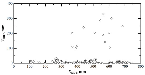 Table 2 summarizes information on the DDT probability for the undiluted C2H4 + 3O2 mixture (β = 0, mixture no. 1 in Table 1). Also presented in the table are the minimum and maximum DDT run-up distances along the X axis, , depending on the layer height. As can be seen, with an increase in the layer height from 80 to 110 mm, the DDT probability increases from 0.3 to 0.7, while a large scatter in is observed: the minimum is in the range of 270–385 mm, while the maximum is in the range of 720–740 mm. The latter values are very close to the value of the right end coordinate, 784 mm. Further increase in the layer thickness increases the DDT probability to 1: in two series of experiments with six and nine repetitions, DDT was recorded in 100% of cases at 140–150 mm and 110–230 mm. In this case, the minimum value virtually does not change and remains in the range of 250–275 mm, whereas the maximum value decreases to 450–485 mm. Thus, the scatter of DDT locations is reduced with the distance from the boundaries of the critical “DDT go–DDT no go” curve.