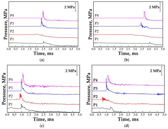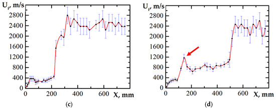 Figure 6 shows pressure records for two experiments with DDT registered in a layer with a height close to the critical (minimum) value with the corresponding minimum (Figure 6a) and maximum (Figure 6b) values and for two experiments with DDT observed in a twice-higher layer with the corresponding minimum (Figure 6c) and maximum (Figure 6d) values. The localized explosion giving birth to a detonation occurs at a certain point in the slit combustor. The arising pressure wave propagates in all directions, namely, as a detonation wave in the fresh mixture and as a shock (retonation) wave in the combustion products. Since sensor P1 is located in the vicinity to the left closed end of the slit, it registers nearly simultaneously both the incident and reflected shock waves, which are weaker than the detonation wave registered by sensors P3 and P4. In addition, Figure 7 shows the dependences of the measured velocities of the luminosity front, , near the slit bottom on the distance travelled along the X axis. After ignition, a stage of rapid acceleration of the luminosity front is observed: the flame-front velocity quickly increases from zero to a speed close to the speed of sound in the initial mixture. This is followed by an extended stage during which the flame slowly accelerates till detonation occurs via DDT. Interestingly, the flame-front velocity in Figure 7b,d exhibits intermediate peaks (shown by arrows in Figure 7b,d) followed by rapid flame deceleration and relatively slow flame acceleration from about 700 to about 1200 m/s. Careful analysis of video frames shows these peaks correspond to the apparent flame breakthrough along the X axis when the curved flame propagates downward and hits the slit bottom.