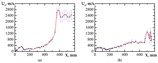 Measured dependences of the flame-front velocities on the distance along the slit bottom during flame propagation in a C2H4 + 3(O2 + 3/5 N2) mixture in a slit combustor with a layer of near-critical height 380 ± 3 mm: (a) experiment no. 812, DDT at 530 mm, (b) experiment no. 813, no DDT.