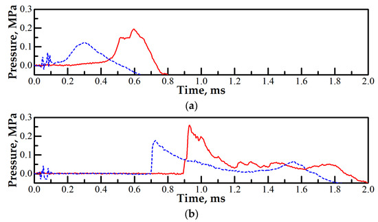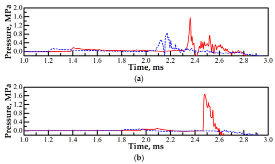 Pressure histories measured by sensors P1 (a) and P2 (b) in experiment no. 812 (solid curve) and no. 813 (dashed curve).