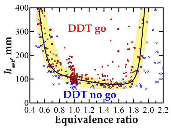 When fuel and oxidizer are supplied separately into the slit combustor, a combustible mixture forms inside the growing layer. As a result, the true composition of the combustible mixture at each point and at each moment in time can differ greatly from its average value. The experiments discussed above were performed for the stoichiometric ratio of the average flow rates of fuel (ethylene) and oxidizer (oxygen diluted with nitrogen). To assess the effect of the overall mixture composition on DDT, we conducted experiments at different ratios of average flow rates of ethylene and oxygen for undiluted C2H4 + 3O2 mixtures. The overall fuel-to-oxidizer equivalence ratio was varied from 0.3 to 2.3. Figure 14 presents the results of the experiments in terms of the “DDT go” and “DDT no go” parametric domains on the plane. Each symbol on the plot represents a different experiment. Experiments with similar initial parameters form groups of closely spaced symbols. As one can see, there is a domain in which different signs (circles for experiments with DDT and crosses for experiments with no DDT) overlap. This is a transition region in which DDT occurs or does not occur depending on a combination of random factors. This transition domain is shown by a semitransparent band in Figure 14. The mean boundary separating the “DDT go” domain from the “DDT no go” domain is shown by the U-shaped curve. Such a shape of the curve demonstrates the presence of critical conditions for DDT in terms of both the height of the layer and the mixture composition. DDT in the slit combustor was observed at ranging from 0.5 to 1.9. In a wide range of fuel-rich compositions with 1.0 ≤ ≤ 1.8, the critical height of the combustible mixture layer remains almost constant at a level of 70–90 mm. A decrease in to ~0.7 leads to a gradual increase in the critical height of the layer. A further decrease in results in a drastic increase in the critical layer height. When a mixture with a fixed is diluted with nitrogen, a very similar pattern is observed. In general, such dependences are caused by an increase in the characteristic time of chemical transformation and therefore a progressive increase in energy losses.