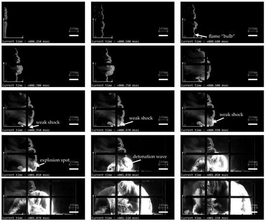 Figure 8 shows video frames of detonation onset via DDT in a layer with a near-critical height of 80 mm and in a layer with a height of 150 mm for mixture no. 1 in Table 1 at the minimum DDT run-up distances. The first line shows frames from which one can judge the height of the layer by the height of the flame front during multifocal ignition: 30 mm in the first case and 220 mm in the second. The second line of the frames is an image of the flame front at the moment of time immediately preceding the DDT. The third line shows video frames immediately after the localized explosions. Further, the fourth and fifth lines show the frames of the detonation wave propagating through the mixture. For comparison, Figure 9 shows similar video frames for experiments in which DDT was observed at the maximum DDT run-up distances.