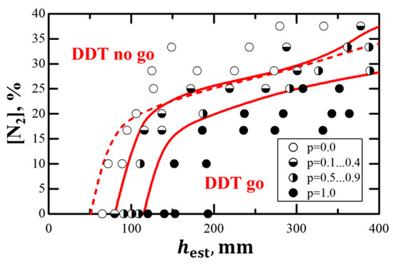 Experimental “DDT go” and “DDT no go” parametric domains on the [N2]– plane for C2H4 + 3(O2 + βN2) mixtures of overall stoichiometric composition. Filled circles correspond to “DDT go” domain; empty circles correspond to “DDT no go” domain; semifilled circles correspond to the transition domain with the “DDT go” probabilities of 0.1–0.4 and 0.5–0.9, respectively; solid curves correspond to the conditional boundaries of the minimum layer height for “DDT go” based on transition from probability to 0 and on transition from to ; dashed line corresponds to the conditional boundary of the minimum layer height for “DDT go” in the homogeneous stoichiometric mixtures [26].