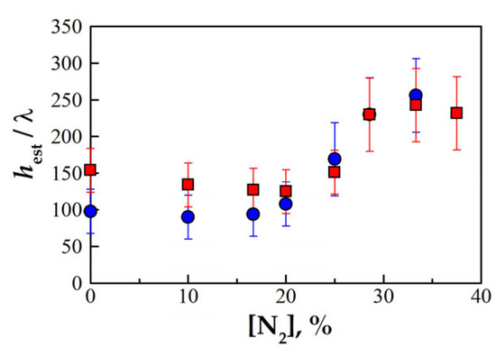 In [42], the approximation for the detonation cell size as a function of nitrogen dilution for ethylene–oxygen–nitrogen mixtures is obtained based on data reported in [39,40]. Figure 19 presents the data of Table 1 for the minimum height of the layer required for DDT in relation to the transverse detonation cell size, (squares). In addition, Figure 19 plots the data from [26] obtained for the homogeneous mixtures (circles). For mixture no. 1 in Table 1, the detonation cell size calculated using the polynomial of Equation (3) is equal to 0.52 mm, while according to the data reported in [43], the detonation cell size is 0.38 mm. Similarly, for mixture no. 6 in Table 1, the detonation cell size calculated using this polynomial is 1.3 mm, while according to the data reported in [40], 0.9 mm, i.e., the detonation cell size is known with a large uncertainty. Compared to , the critical heights of the layers of mixtures no. 1 and no. 6 in Table 1 are (150…210) ( 0.52 mm [42] and 0.38 mm [43]) and (210…300) ( 1.3 mm [42] and 0.9 mm [40]), respectively. The greatest difference is observed for the undiluted C2H4 + 3O2 mixture, when the critical layer height is minimal. For this mixture, dilution with ambient air during slit fill and mixing nonuniformity play a key role. As the degree of mixture dilution with nitrogen increases, the critical height of the layer increases, but the role of the two factors mentioned above seems to decrease and the results no longer depend on the method of obtaining the combustible mixture. It is worth noting that at large degrees of mixture dilution with nitrogen, the cell size becomes comparable with the slit width. In these conditions, the slit width becomes an additional parameter affecting the detonation cell size [45,46] and the critical height of the layer.