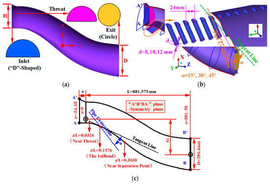 The S-shaped inlet studied here is a half flush-mounted inlet with large boundary layer ingestion, with a Mach number at the inlet of about 0.37. The diameter of its exit section, D, equals 280.4 mm, and the design mass flow of it, mdesign, equals 8.997 kg/s. The suction control devices are comprised of 12 pipes with suction pipe diameters d equaling 8 mm, 10 mm, or 12 mm, as shown in Figure 1b. All suction pipes are installed at the same acute angle (β = 15°, 30°, 45°) with the local tangent line. The arrangement of these suction pipes was chosen based on the conclusion obtained by Harouni that the most practically effective flow control scheme was the circumferential ejector scheme [32]. Furthermore, the position near the throat section, just at the 1st bend, and near the separation point are selected as three typical suction locations, as shown in Figure 1c, which is an additional variable relative to the previous research [32].