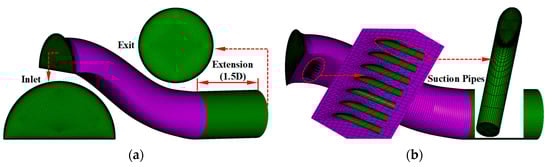 With the rapid development of computational fluid mechanics (CFD) in recent years, more accurate numerical simulation methods such as LES and DNS have been put forward and applied in some simple or simplified models [33,34,35]. However, as concluded in Yang’s research paper, LES is likely to become used for a broader range of flow problems and more complex problems, including more multi-disciplinary applications, in the future. Nevertheless, there are still significant challenges (such as the big shortcoming in implicit filtering, and time cost) remaining before LES can become a reliable, robust engineering analysis tool that can be used as an alternative to RANS [33]. As to DNS, the challenges for its wide application are greater, such as the economic and time costs. So, the numerical simulation in this study uses the commercial software ANSYS CFX 18.0 to solve steady viscous Reynolds-Averaged Navier-Stokes (RANS) equations with a time-perusing finite volume method. The Shear Stress Transport (SST) turbulence model is employed for this research as it is the highest fidelity working turbulence model and is well established for its separated flow modeling ability [36,37]. The spatial discretization uses a second-order upwind scheme. To reduce the effect of the artificial outlet boundary on the internal flow field, the calculation domain has been obtained after the extension of the original serpentine diffuser. As shown in Figure 2a, the extensive section is about 1.5 times the diameter of the diffuser exit.