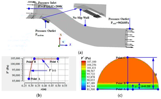 The boundary conditions of the suction control cases are shown in Figure 3. Clearly, total pressure, P*, and total temperature, T*, of 288 K are set at the inlet of the S-shaped air intake as the inlet boundary conditions. Because of large boundary layer ingestion, the total pressure distribution at the air intake inlet is not uniform, as shown in Figure 3b,c. The thickness of the boundary layer δ equals 20 percent of the height of the air intake inlet (δ = 0.2 H). The total pressure distribution in the normal direction of the boundary layer—in other words, the first section of the function (P* = P*(x)) is obtained through the previous experimental data fitting. Psuction is the external environmental pressure given at the exit of the suction pipes, which acts as a throttle valve. As to the schemes without suction control, this setting is not available here. What should be noticed is that the suction mass flow is not controlled by changing the value of Psuction; it is controlled by changing the diameter of the suction pipes. The usage of this method is because the suction pipes are treated as a simple bleed valve. Static pressure, Pexit, is set at the exit of the S-shaped inlet as the outlet boundary condition. All the wall faces are set as adiabatic with no slip.