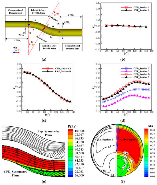 Figure 4. Comparisons between the numerical results of the S-duct for validation and the experimental data given in the references [37,38,39]. (a) S-duct for validation [37,38,39]. (b) Static pressure coefficient at Section A. (c) Static pressure coefficient at Section B. (d) Static pressure coefficient at Section C and Section D. (e) Streamline distribution on the symmetry plane of the S-duct. (f) Mach number distribution at the S-duct exit.