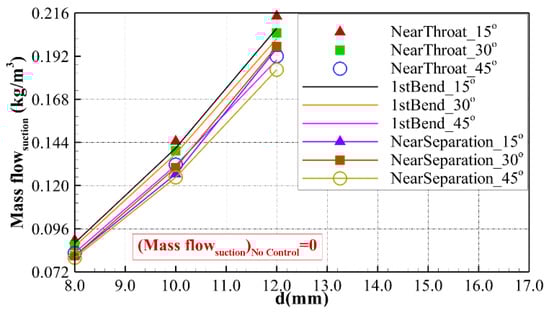 Figure 5 shows the suction mass flow change trend with the variation of the suction pipe’s diameter. Clearly, suction mass flow increases significantly with the increase of the suction pipes’ diameter as the suction location and angle are fixed. Likewise, the suction location and angle can directly influence the amount of suction mass flow. It can be easily found that suction further upstream means more suction mass flow if the installing angle and the diameter of the suction pipes remain constant.