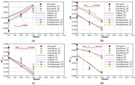Figure 7. The change of aerodynamic performance parameters with the variation of suction control parameters. (a) The total pressure recovery coefficient (σ). (b) The occupation ratio of low-energy fluid (AR). (c) The circumferential total pressure distortion coefficient (DC120). (d) The swirl distortion coefficient (SC120).