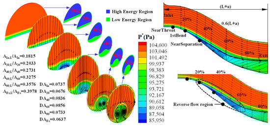 Nonuniform total pressure has been directly given at the inlet of the S-shaped air intake. Consequently, as shown in the left image of Figure 8, the obvious high total pressure region and the significant low total pressure region always coexist in all sections, and the area ratio between them has been affected by the intensity of the second flow, the variation of the cross-section area, and shape. In addition, the embryo of the “counter vortex” formed at the cross-section just between the 0.2(L + a) location and the “NearSeparation” point. The shape of the region covered by the low-energy fluid at the lower part of the sections is obviously affected by the intensity and size of the “counter vortex” once it is formed. Finally, the shape of the low-energy region at the exit of the air intake is mainly characterized by the approximately circular shape of the “counter vortex”. From the total pressure contour and surface streamline on the symmetry plane of the air intake given on the right side of Figure 8, it can be easily found that severe separation occurs just around the separation point at the bottom wall. At the same time, severe adverse flow appeared in this separation region and the total pressure in the adverse flow region was relatively lower.