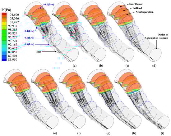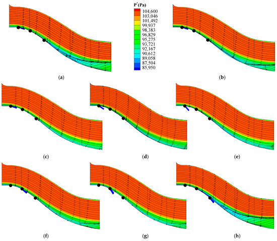 Figure 10. Surface streamline and total pressure contour on the symmetry plane of the calculation domain in different schemes. (a) NearThroat_15°_8mm. (b) NearThroat_15°_10mm. (c) NearThroat_15°_12mm. (d) NearThroat_30°_12mm. (e) NearThroat_45°_12mm. (f) 1stBend_15°_12mm. (g) 1stBend_30°_12mm. (h) NearSeparation_15°_12mm.