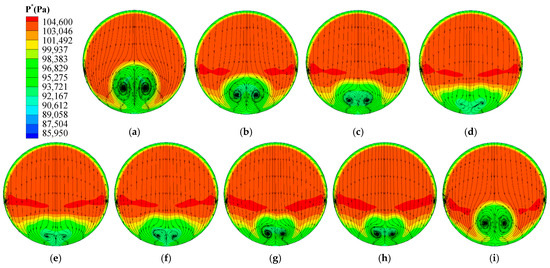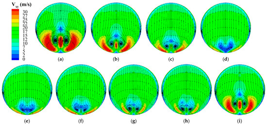 Figure 12. Second flow distribution and surface streamline on the exit of the air intake in different schemes. (a) NoContorl. (b) NearThroat_15°_8mm. (c) NearThroat_15°_10mm. (d) NearThroat_15°_12mm. (e) NearThroat_30°_12mm. (f) NearThroat_45°_12mm. (g) 1stBend_15°_12mm. (h) 1stBend_30°_12mm. (i) NearSeparation_15°_12mm.