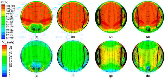 Figure 15. Total pressure, surface streamline, and second flow distribution on the exit of the air intake in the improvement schemes. (a) P*_1stBend_15°_12mm. (b) P*_Large massflow suction. (c) P*_1stBend_15°_12mm_Vanes. (d) P*_No scution_Vanes. (e) Vxy_1stBend_15°_12mm. (f) Vxy_Large massflow suction. (g) Vxy_1stBend_15°_12mm_Vanes. (h) Vxy_No scution_Vanes.