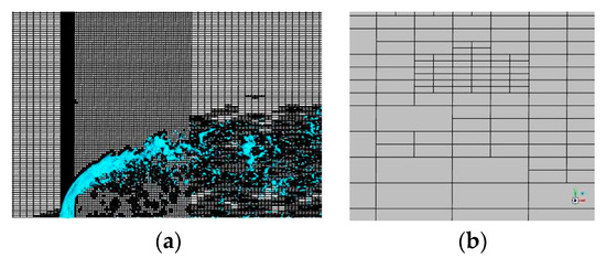 The VOF method can capture the motion and deformation of the gas–liquid interface, allowing for a meticulous investigation of the atomization process of jets by analyzing the distribution of the two-phase flow field. However, there is a large number of small droplets in the flow field, requiring the grid to be sufficiently fine and computationally intensive. Grid adaptation technology can automatically adjust the grid based on solution variations and requirements, thereby improving both computational accuracy and efficiency. In this study, in order to reduce computational costs and enhance computational accuracy, the VOF method was combined with grid adaptation technology to simulate the spray process of jets. The accuracy of the numerical results was validated with experimental results [25]. The structured grid was generated by ICEM, with refinement near the jet region. The initial grid consisted of 990,000 cells, and during the later stages of adaptive refinement, it increased to 11,600,000 cells. The maximum refinement level is three, and it is dynamically adaptive, and the minimum grid size is 0.011 mm (about 0.018 D), which enabled the details of the jet breakup to be captured [26]. The adapted grid is shown in Figure 1.