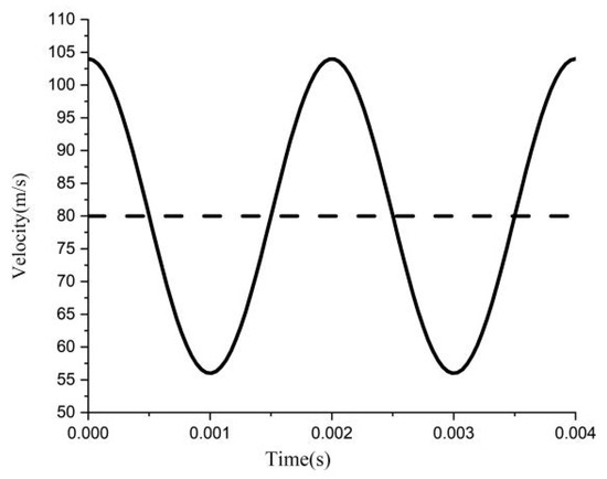 This study investigates the fuel atomization process inside the primary blade passage of a certain swirl injector [27]. This process is simplified as the direct injection atomization process of a single-point fuel in a three-dimensional rectangular cuboid under a transverse airflow. Figure 2 and Figure 3 show a schematic diagram and dimension diagram of the computational domain, respectively. The left side represents the air inlet, the right side represents the outlet, and the circular hole on the bottom surface represents the jet inlet, while the rest are the wall surfaces. The computational ranges in the x, y, and z directions are [−12 d, 48 d], [0, 30 d], and [−4 d, 4 d], respectively. Here, d represents the nozzle diameter, which is 0.6 mm. In numerical calculations, boundary conditions need to be specified for the air inlet, jet inlet, outlet, and wall surfaces. The boundary condition type for both the air and jet inlets is a velocity inlet, and the outlet is a pressure outlet, assuming that the physical quantities at the outlet remain constant. The wall surface type is set as a no-slip wall. In this study, the operating parameters of the gas and jet under steady-state conditions are shown in Table 1. In order to investigate the impact of transverse velocity fluctuations on jet fragmentation, an oscillation is added at the gas inlet, and Figure 4 shows the velocity profile at the gas inlet. Its mathematical expression is expressed as