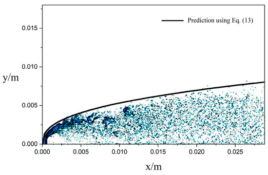 Figure 5 presents a comparison between the simulated penetration depth of the jet under steady crossflow conditions and the aforementioned empirical formula. It can be observed that the jet penetration depth agrees well with the results calculated from the empirical formula, but the second half of the jet is slightly lower than what the formula predicts. This is because factors such as the momentum flux ratio and jet diameter have an influence on the penetration depth of the jet. Additionally, small droplets at the periphery of the jet may not have been captured because of the limited computational conditions. Nevertheless, the simulation results still provide an accurate representation of the spatial distribution and mixing characteristics of the jet to a certain extent.