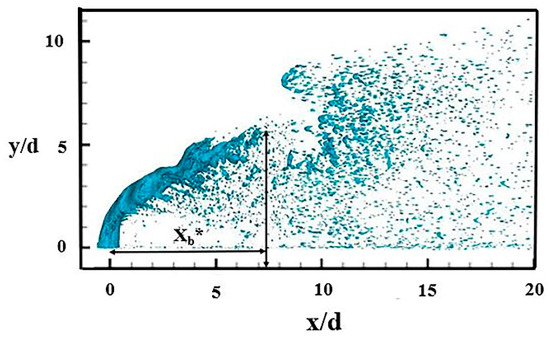 In addition, Wu et al. [3] concluded that the liquid jet always breaks up about eight times the nozzle diameter downstream of the nozzle outlet, independent of the injection conditions, and obtained the empirical equation , with xb as shown in Figure 6. Figure 7 shows the initial breakup of the jet under steady-air-velocity crossflow conditions, and the simulation result of xb* is 7.25d. There is an error of 10.05% between the empirical and simulated values.