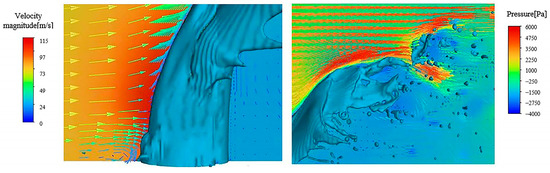 Figure 8 and Figure 9 illustrate the pressure contour and velocity vector of the jet at the root and tail under the conditions of a steady/oscillation inflow velocity at t = 0.5 ms, respectively. Regardless of whether the air inflow is steady or oscillating, the root morphology of the jet remains the same. This is because the presence of the boundary layer results in a lower gas velocity at the root of the jet, and the aerodynamic force is not sufficient to cause jet deformation. As the jet penetration depth increases, the contact area between the airflow and the jet increases, and the interaction between the gas and liquid phases also increases, leading to the deflection and deformation of the jet. The transverse inflow stagnates in front of the jet due to its obstruction, creating a small high-pressure zone, and then experiences flow separation. While the remainder of the airflow runs over the surface of the jet, part of the gas flow produces a recirculation close to the wall. Under the pressure difference before and after the jet, the transverse airflow passes through the continuous jet, causing the jet to break up.