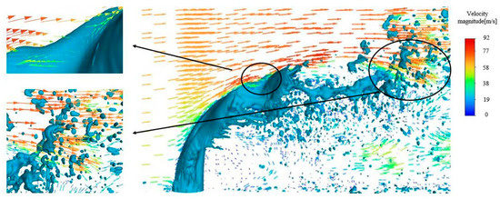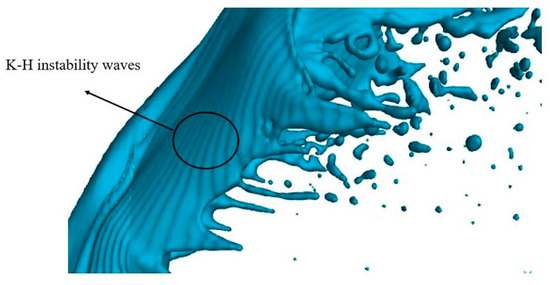 Figure 14 depicts a vector graph of the jet surface velocity under steady conditions at t = 0.75 ms. The presence of surface wave structures on the jet’s surface can be attributed to the pressure difference before and after the jet, resulting in the occurrence of Rayleigh–Taylor instability and the formation of Rayleigh–Taylor unstable waves [24]. The incoming gas stagnates and separates at the surface wave, giving rise to vortices at the trough of the wave. This enhances the interaction between the gas and the liquid. While a portion of the gas continues to propagate along the jet surface, the vortices at the trough of the wave exert a dominant influence on the jet, leading to its breakup at the trough of the surface wave. Subsequently, under aerodynamic forces, the jet further disintegrates into smaller droplets.
