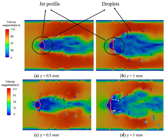 Because of the tangential velocity gradient between the air and the jet, Kelvin–Helmholtz (K-H) instability waves are produced and emerge after the high-velocity air flow with centerline symmetry in the jet deviates along the surface of the jet [26]. Eventually, the jet forms a filament and further breaks up into droplets, as shown in Figure 10. Figure 11 presents the deformation of the liquid column at y = 0.5 mm and 1 mm, as well as the velocity cloud map on the x–z plane perpendicular to the jet direction under steady/oscillating inflow conditions at t = 0.5 ms. From Figure 11, it can be observed that compared with the steady-air inflow conditions, the deformation of the liquid column is more conspicuous under oscillating inflow conditions, and a larger number of droplets are detached from the liquid column surface. This is because the fluctuation of the airflow under oscillating inflow conditions causes aerodynamic fluctuations that make the airflow on the leeward side of the jet more turbulent, resulting in more droplets being detached from the jet column surface.