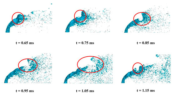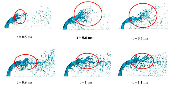 Figure 12 and Figure 13 show the development of the jet flow under steady/oscillating air inflow conditions within t = 0.5~1.5 ms, respectively. In the case of a steady air inflow, surface waves emerge on the jet surface due to the interaction between the gas and liquid, as well as the turbulence generated by the jet itself. These surface waves then propagate along the jet, characterized by an increase in their wavelength and amplitude. Eventually, the jet breaks up at the trough of the surface wave, forming large liquid fragments. Under the influence of aerodynamic forces, these liquid fragments continue to break up into smaller droplets, accompanied by the development of the next surface wave.
