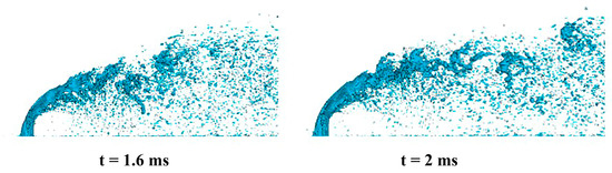 Near-surface interpolation was performed using the Geometric Reconstruction Scheme, which accurately depicts the interface between the fluids on generalized unstructured meshes in Fluent. In the VOF simulation, the interface compression algorithm played a crucial role in identifying the interface compression phenomenon. Commonly used interface compression algorithms in academic research include the CSF (Continuum Surface Force) [21], the CICSAM (Coupled Interface Compression and Sharpness Algorithm Method) [22], and others. The CSF model is utilized in this study. The CSF method converts the interfacial surface force into a corresponding volume force, which is then incorporated into the Navier–Stokes equations. The SST k–ω SBES model was employed to simulate the turbulence in this study. The SST k–ω model considers the transport of turbulent shear, as defined in the turbulent viscosity, applied to wall-bound and free-shear flows. The SBES model is capable of dynamically switching methods within the computational domain based on the computational requirements, thereby providing a more accurate calculation of the flow field that closely resembles real conditions. The discrete phase of the time term in the calculations was used with first-order accuracy, and the diffuse phase of the momentum equation is in a second-order windward format [23]. The unsteady time step was 1 × 10−7 s, and 30 steps were iterated in each time step, and the unsteady time t = 4 ms was calculated.