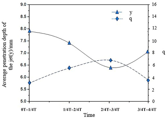 Figure 19 shows the variation trend of the penetration depth of the jet during the second cycle under oscillation crossflow conditions. The average penetration depth of the jet during each 1/4 cycle at the same time interval is considered the average penetration depth of the flow during that period. The average liquid-to-gas momentum flux ratio, q, is calculated by averaging the air velocity over the same time interval. From 0 T–1/4 T to 2/4–3/4 T, the average jet penetration depth decreases, and q increases. From 2/4 T–3/4 T to 3/4T–4/4 T, the average penetration depth increases, while q decreases. Previous research has shown that the jet penetration depth increases with q [13,14], and it can be concluded that the response of the jet penetration depth to crossflow oscillations lags by half a cycle, as observed in Figure 19. This behavior is most probably due to the inertia of the liquid jet. Based on this trend, the average penetration depth of the jet should increase in the next 1/4 T, aligning with the maximum average jet penetration depth during the 0–1/4 T time period within this cycle, forming an upward and downward flapping model.