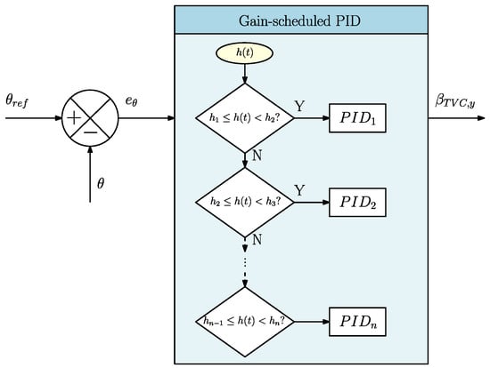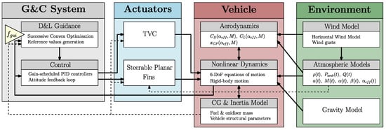 - The generation of corrections using classical linear feedback control through gain-scheduled PID controllers. Then, commands are allocated between the TVC system and the steerable planar fins according to the level of thrust. This feature also allows a certain modularity for studying different actuation configurations according to the mission requirements (e.g., propellant consumption) and the flight phase: TVC-only, planar fins-only, or both.