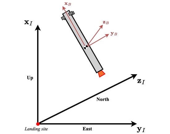 Two reference frames are considered and are shown in Figure 2. The first is the landing-site-centred reference frame. Its origin is at the landing site and it is an up–east–north reference frame, such that the -axis points up, the -axis east, and the -axis north. This reference frame is considered inertial, and the equations of motion refer to it. Simulations start from an initial position in this reference frame , with an initial velocity . The second reference frame is the vehicle’s body-fixed reference frame. This is fixed to the vehicle’s CG, and the basis vectors can be defined as follows: the -axis lies along the vehicle’s longitudinal axis, the -axis is defined so as to remain perpendicular to the pitch plane, and the -axis completes the right-handed system (and thus remains perpendicular to the yaw plane). Following these definitions, the roll, pitch, and yaw angles (, , and , respectively) represent the orientation of the body-fixed reference frame with respect to the landing-site-centred inertial reference frame. These angles are useful for controlling the vehicle trajectory. However, in the formulation of the equations of motion, the rotation quaternion is used to translate the attitude of the vehicle. Therefore, represents the rotation matrix from the inertial reference frame to the vehicle’s body-fixed reference frame. The angular velocity is defined in the body-fixed reference frame with an initial value .