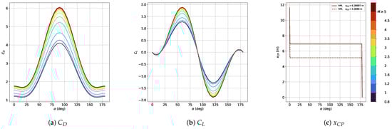 Aerodynamic parameters are obtained using the Supersonic/Hypersonic Arbitrary-Body Program (S/HABP) for a cylindrical-shape first-stage rocket, with an angle of attack from 0 to 180 deg and a Mach number from 0.8 to 5. This programme, which was developed in 1973 by the United States Air Force Flight Dynamics Laboratory [] and used by the National Aeronautics and Space Administration, has been adapted to obtain an aerodynamic database composed of the aerodynamic coefficients and the CP as function of the Mach number and the aerodynamic angles. More details on the development of the aerodynamic database and its validation are given in Ref. []. These coefficients are then linearly interpolated in the simulator according to the current flight conditions. The variation of , and with respect to and is illustrated in Figure 3.