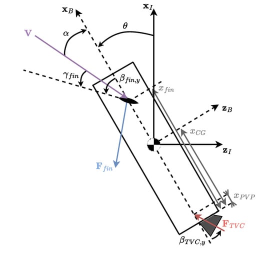 The trajectory of the vehicle during descent is controlled by adjusting the magnitude and direction of the thrust vector generated by the main engine. This is achieved by the TVC actuator deflecting the engine nozzle by and , respectively, along the -axis and -axis. The required thrust magnitude and deflection angles are obtained from the guidance algorithm (Section 3) and the control method (Section 4), respectively. Decoupling between translational and rotational dynamics is common for TVC control due to the fact that the attitude of the vehicle can change faster than its trajectory []. Thus, the TVC-generated force and moment can be expressed in the body-fixed frame by