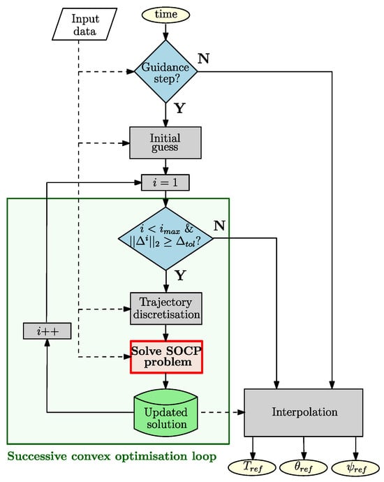 In this study, the successive convex optimisation guidance algorithm is implemented in MATLAB using the CVX library [] to formulate the convex problem and the ECOS routine [] to solve it. At each simulation instance defined by the simulation rate , the reference thrust profile and the reference attitude angles are calculated from the most recent guidance solution by linear interpolation. In fact, this solution is stored as an online lookup table, which is updated at each guidance step, with the guidance update frequency Hz, that is, every 10 s. The guidance algorithm inside the “D&L Guidance” building block of the simulator (recall Figure 1) is schematised in Figure 5.