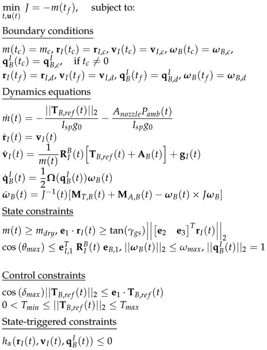 It can be observed that the 6-DoF nonlinear descent dynamics displayed in Equations (4)–(6) are re-adapted to the 6-DoF descent of a powered-only first-stage booster, meaning that only the thrust vector of the main engine, denoted hereafter as , is considered as the control input . In fact, the steerable planar fins are not included in the optimisation problem for the rocket D&L in order to avoid adding complexity due to the nonlinearities generated by the addition of these aerodynamic loads. This is common practice for launcher re-entry, since the thrust vector (magnitude and direction) is a good indicator for reference trajectory generation. The allocation between the actuators, TVC, and steerable planar fins is achieved afterwards by the control subsystem using the reference values obtained in terms of thrust magnitude and attitude angles.