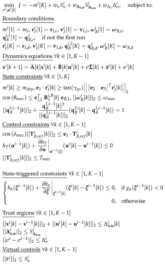 Moreover, a particular class of convex optimisation, successive convex optimisation, can be applied to approximate the remaining nonlinearities in the optimal landing problem, such as the aerodynamic effects, which have previously been ignored. This consists in iteratively solving convex optimisation SOCP subproblems in which the nonconvex dynamics and constraints are repeatedly linearised using information originating from the previous iteration’s solution. This algorithm was first developed by Szmuk et al. in Ref. [] and then adapted in different ways in Refs. [,]. In this paper, the successive convex optimisation algorithm relies on the work achieved by Guadagnini et al. in Ref. [], where the strategy defined in Ref. [] was improved to be applicable in a closed-loop fashion for a 6-DoF controlled dynamics simulator.