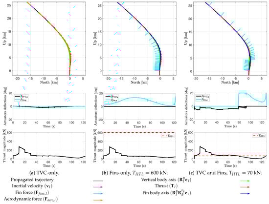 For this study, no wind was considered, and neither propellant sloshing effects nor flexible bending modes were included, since the described simulator is still at an early design stage and more complex studies are necessary for future developments. Three different actuation configurations were tested. The first one with TVC actuation only used the control architecture defined in Section 4.1 and considered fixed planar fins with 0 deg deflection. The second used only planar fins actuation with the control architecture defined in Section 4.2 (with ). Finally, the third configuration used TVC and planar fins actuation with a thrust magnitude limit of . The initial and final conditions are described in Table 4. The initial conditions allowed us to study a trajectory evolving mainly in the pitch plane. Other simulations were also carried out for a trajectory mainly in the yaw plane and for a trajectory in both planes, showing similar results; therefore, they are not displayed in this paper.