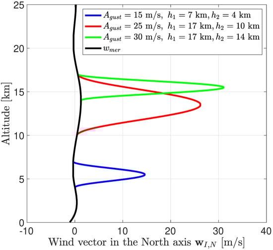 Finally, the constant wind is computed with the US Naval Research Laboratory model Horizontal Wind Model 14, also available in Ref. [], which generates the meridional and zonal components of the wind for a set of geophysical data. Wind gusts are modelled as a cosine-shaped function, so the user can define the amplitude of the gust and the altitude at which it occurs. The function is expressed as follows: