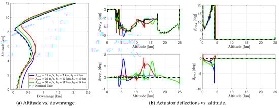 From these simulations, it is possible to observe how the trajectory was modified due to the corresponding wind gust by examining the altitude versus downrange profile in Figure 11a. In fact, Case 3 with a strong gust at an upper altitude did not impact the trajectory profile considerably, since it followed the nominal profile relatively well. However, we could observe with Cases 1 and 2 that at a lower altitude such gusts could modify the trajectory quite significantly, even if they were not particularly strong ( for Case 1). This statement was confirmed by considering the performance results in Table 6, where Case 1, in which the wind gust occurred at the lowest altitude, shows the highest final errors. Furthermore, looking at the control commands generated in Figure 11b, slight changes in the deflection angles compared to the nominal profile can be observed at the times of the gusts. Since the gusts also occurred in the yaw plane, we also noticed the emergence of deflections arising from the actuators controlling the yaw motion. These also impacted the rest of the trajectory, since yaw fin deflections were generated when the wind gusts had stopped. Overall, even though the controller was not designed to specifically counteract the wind (which was made possible by including the wind as an exogenous input in the control synthesis []), it still provided satisfactory performance results within the desired bounds for precise landing defined previously, and therefore enabled us to study G&C interactions in the presence of wind.