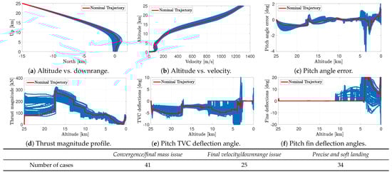Finally, the G&C system was tested within the 6-DoF controlled dynamics simulator in the presence of multiple uncertainties and disturbances through a 100-run Monte Carlo analysis. Note that 100 cases might not have been sufficient to properly assess the robustness of the present control system. However, the objective of the study was not to provide a high-performance control system, but rather a relevant tool to perform controllability analyses of reusable rockets during the D&L phase. Therefore, the robustness analysis carried out here had to first ensure that the present tool could adapt to a range of different trajectories and be evaluated with this number of runs. The corresponding dispersions are indicated in Table 7. Note again that neither sloshing effects nor flexible modes were included in this analysis. The results of the analysis are depicted in Figure 12, showing the errors in terms of position, velocity, and pitch angle, as well as the corresponding control commands in terms of thrust magnitude, TVC gimbal angle, and fin deflection angle profiles. At the bottom of the figure, a table gives the number of cases belonging to each of three different categories: (i) those for which a convergence issue occurred or the final mass obtained was greater than the dry mass of the vehicle and that were therefore considered as failure; (ii) those for which the final velocity or downrange did not verify the criteria defined in Section 5.1; and finally (iii), those whose results satisfied these criteria.