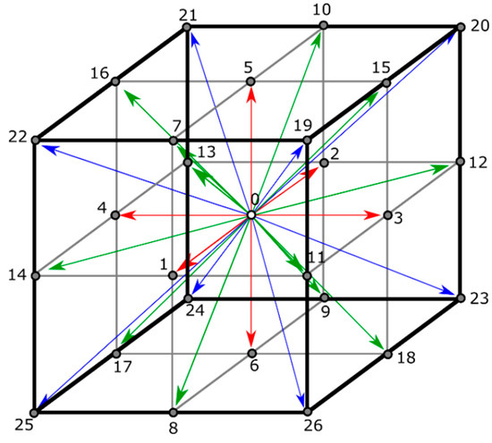 D3Q27 LBM model (The numbers 0 to 26 represent the discrete velocity vectors in 27 directions).