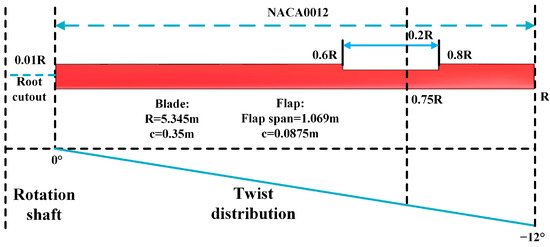 The modified full-scale Z–11 helicopter rotor is selected as a reference to model the ECR for the numerical simulation. As the time cost and computational complexity of aeroelastic coupling and simulation are significant, the blade deformation is neglected to simplify the problem. For this study, the rigid blade model is employed. The ECR model consists of three blades with an NACA0012 airfoil section of a chord length of 0.35 m and a linear twist of −12° from the root cutout to the blade tip. The rotor radius is 5.345 m, and the rotational speed is 400 rpm, corresponding to a blade tip Mach number of 0.659. Moreover, the NACA0012 airfoil is also selected for modeling the flap; the flap span, chord, and midspan locations are 0.0875 m, 1.069 m, and 3.7415 m, respectively. The detailed parameters for the ECR model are shown in Figure 3.