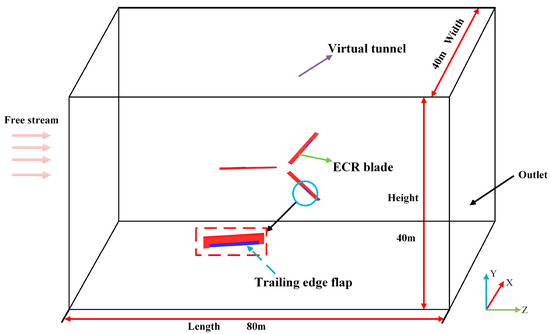The virtual wind tunnel illustrated in Figure 4 is employed for the numerical simulation with the size of 80 × 40 × 40 m in the Z, Y, and X directions, respectively, to avoid the wall effect. The free stream direction is from −Z to +Z, and the different advance ratios in forward flight conditions can be simulated by setting different wind speeds. For the hovering conditions, the wind speed is set to 0. As for the setup of the flow field and boundary conditions, the flow environment in this paper is set as the single-phase, isothermal, and external flow, and the inlet and outlet boundary conditions are set as the velocity inlet and zero-gauge-pressure outlet, respectively. The periodic boundary condition is applied for the other four planes. In addition, the non-equilibrium enhanced wall function for the blade and flap wall boundary condition is employed to include the effect of the pressure gradients in the flow separation prediction. In terms of other simulation settings, the time step is set to 0.00125 s, which means that calculation results can be acquired with an azimuthal step of 3°. The total simulation time is 1.2 s, which corresponds to the time of eight revolutions. Moreover, the inputs of the blade and flap, including collective pitch, lateral cyclic pitch, and longitudinal cyclic pitch, for the hover and forward flight conditions will be thoroughly described in Section 3.
