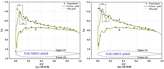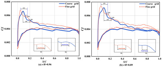 Figure 6 illustrates the pressure coefficient distributions at two blade spanwise locations ( = 0.96, = 0.89) with the experimental data for comparison; it can be observed that the pressure distributions on the pressure side exhibit a good agreement with the experimental data and are relatively insensitive to the quality of the mesh, except for the peak prediction on the leading edge. However, a large difference and the fluctuation can be seen on the suction side, especially at the leading edge; the major reason for the discrepancy is that the suction side exhibits a severe flow detachment, and the relatively coarse grid cannot accurately capture the flow behavior at the leading edge. Figure 7 presents the friction coefficient distributions to further investigate the underestimation of the distributions. Within the or region, the initially decreases dramatically, corresponding to a relatively large adverse pressure gradient, which reduces the airflow velocity towards the trailing edge, causing the to increase. Subsequently, it increases slowly and declines again, forming a small hump, which implies the phenomenon of flow separation and reattachment, resulting in the decrease and subsequent increase in the . The peak of the hump will decline due to the reduced external velocity, and thus the amplitude of the increase will diminish. Additionally, the peak can be predicted accurately with the improvement in mesh quality. It means that the spatial lattice resolution employed for this study can accurately predict the aerodynamic load within an acceptable range of error but may not accurately predict the flow behavior at the leading edge. The fluctuation may decrease, and the pressure distributions may be better in agreement with the experimental data with the further refinement of lattice resolution. Nevertheless, the extra fine lattice resolution is not employed, taking into account the computational resources and numerical simulation time, which will be the future work to be conducted.