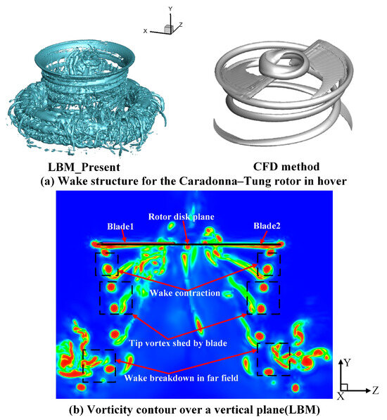 (1) The aforementioned validation results of the convention rotors in hover and forward flight conditions demonstrate the feasibility of the LBM to be employed for simulating the unsteady rotor flow field and analyzing the rotor aerodynamic characteristics. Its results perform with the fine computational accuracy as other aerodynamic analysis methods.