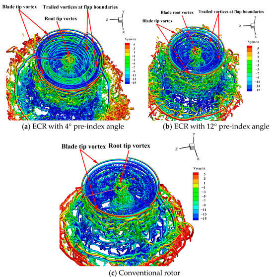 The wake flow field and disc-induced inflow distributions will significantly differ due to the difference in flap collective pitch trim variables. Figure 10 demonstrates the wake structure under different blade pre-index angles predicted by the LBM, compared with that of a conventional rotor. To further investigate the effect of different distributions of wake on the induced inflow distributions, the wake isosurface diagrams of the Q-criterion are colored with velocity in the y-direction. The wake flow field of the ECR, due to the introduction of the flap, is characterized not only by concentrated tip and root vortex but also by the trailed vortices at flap boundaries. Conversely, the wake flow field of the conventional rotor only demonstrates intense blade root and tip vortex. Moreover, at the blade pre-index angle of 4°, the relatively large flap upward deflection results in a more intense flap tip vortex compared to the situation with the blade pre-index angle of 12°.