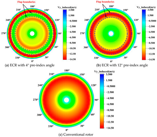 Figure 11 illustrates the time-averaged disc-plane-induced inflow distribution of ECR under different blade pre-index angles, with that of conventional rotor for comparison. At the blade pre-index angle of 4°, due to the influence of intense wake vorticity shed from both ends of the flap, the induced inflow in the flap segment decreases while an increasing trend of the induced inflow can be observed at the exteriors of the flap segment. The maximum value of the induced velocity occurs in the region adjacent to the flap segment. As the blade pre-index angle increases to 12°, the disc-plane-induced inflow distributions contrast with the situation of the blade pre-index angle of 4°; the intense flap tip vortex shed from both sides of the flap results in the increase in induced inflow in the flap segment, while simultaneously decreasing the induced flow in the region adjacent to the flap segment. The maximum induced inflow in the entire disc plane is situated in the flap segment, and the prominent upwash emerges near the blade tip due to the wake contraction. In addition, it can also be observed that the induced inflow distributions of the conventional rotor exhibit a uniform distribution. Therefore, the aforementioned results demonstrate that the distribution of ECR-induced inflow will significantly change due to the flap deflection compared to the conventional rotor, and the intense flap wake vorticity at flap boundaries is the main reason for this phenomenon.